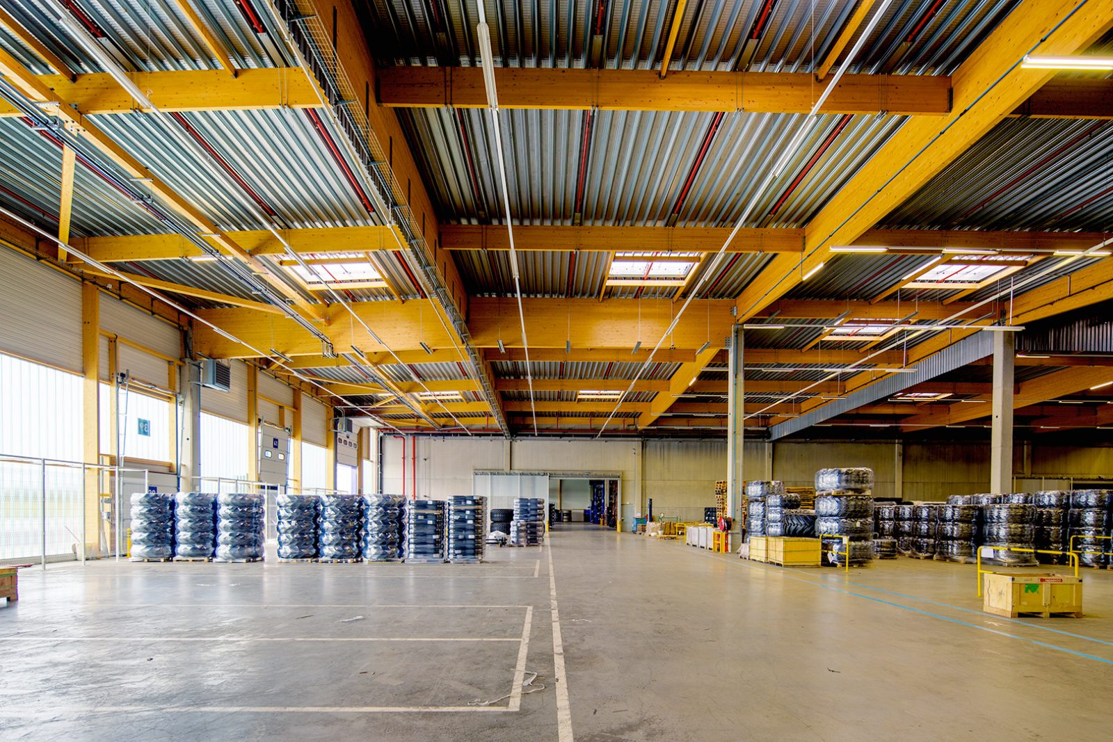 La charpente en lamellé-collé dans le hall de stockage des pneumatiques procure au lieu une ambiance chaleureuse.